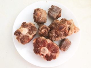 鍋里加入冷水,加入,放入牛骨,水开后焯5分钟