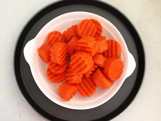 削皮,把胡萝卜用狼牙刀切成1㎝厚的厚片