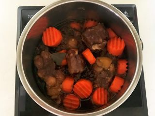 烧到牛骨上面的肉用筷子能够穿透即可,加入胡萝卜,翻炒均匀,大火烧开后小火慢烧15分钟