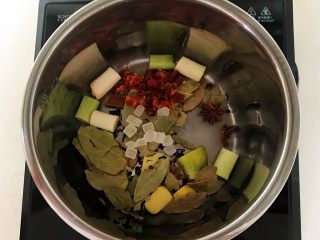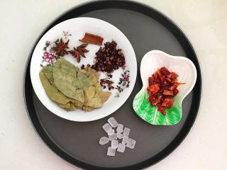 锅烧热后加入1勺,油烧热后加入葱段和姜片,香叶,花椒粒,桂皮,八角,炒出香味,加入冰糖和辣椒段,翻炒均匀