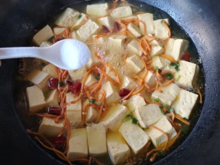 将切块后的豆腐焯水1-2分钟,去除豆腥味;在水中加点盐,可让豆腐更能入味。