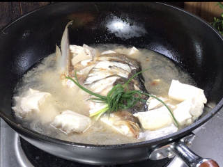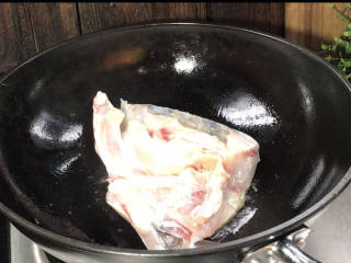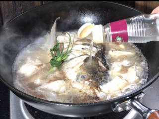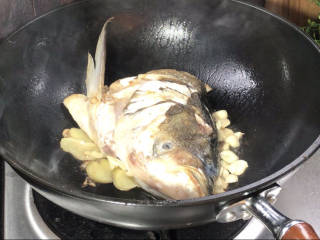 起锅热油,放入鱼头先不要翻动,中火,煎至出香味后翻面