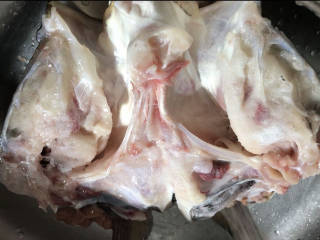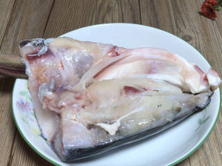 将腌制好的鱼头再洗净,切下半个鱼头,沥水备用