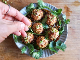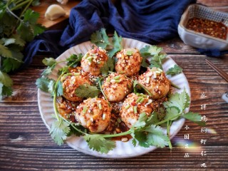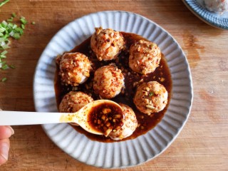 将调好的凉拌汁浇在蒸好的丸子上。