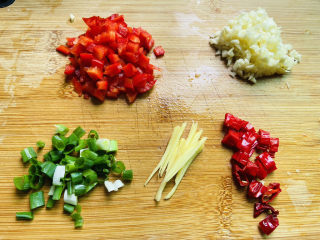 切好葱花、姜丝、红椒丁、干