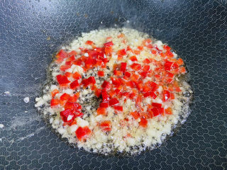 起油锅放入蒜末、红椒丁、干辣椒爆香
