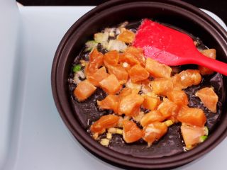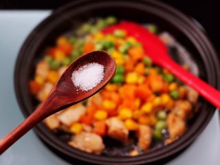 这个时候加入,,丁,中火进行翻炒,加入一小勺纯净水,中小火炒至3-5分钟左右。