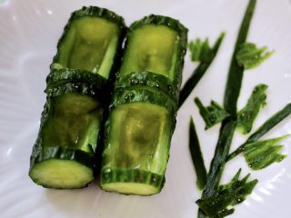 摆放在盘子中,用黄瓜皮做两根竹子做装饰,再用黄瓜皮剪出叶子,装饰竹子上。