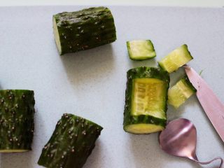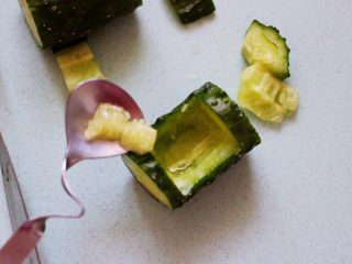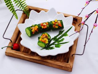 把炒好的鸡肉蔬菜丁,装入黄瓜盅里即可食用,迎新年的美好寓意。