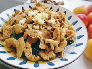 拍蒜切碎,放在肉片上,起锅烧油,油热浇在蒜末上即可,滋滋作响,香气扑鼻。