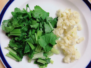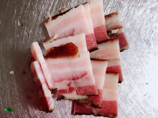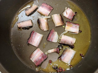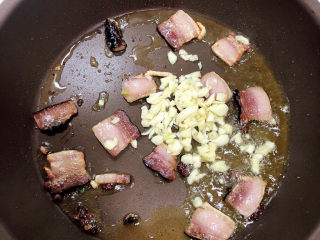 腊肉翻面继续煸至表面金黄,放入蒜爆香。