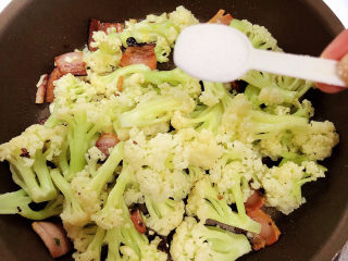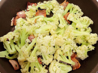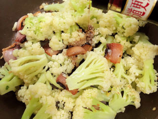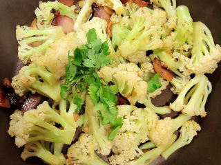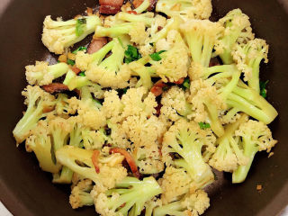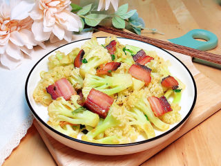 香气四溢的腊肉炒花菜,营养美味。脆爽的花菜与腊肉同炒,花菜尽收腊肉的滋味变得鲜香无比。 花菜质地细嫩,味甘鲜美,食后极易消化吸收,其嫩茎纤维,烹炒后柔嫩可口,适宜于中老年人、小孩和脾胃虚弱、消化功能不强者食用。