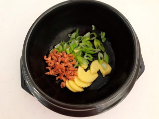 砂锅里面加入葱姜和干虾仁