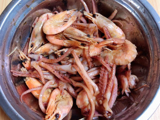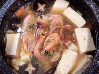 开盖儿,放入八爪鱼和虾。盖盖继续小火儿煲5分钟。
