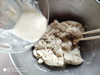 倒入开水,开水的量根据其糙米粉的干湿度酌情增减。我的粉比较干,加了380克水软硬度正好。