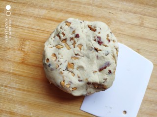 将加入枣碎的粉团稍微揉匀,这时粉团会有点粘,可以借助刮板只要把枣和粉团混合均匀就行。