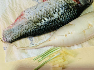 萝卜,洗净,鲫鱼特别黑色内膜要洗干净,表面撒点盐用剪刀反刮,把鱼表面粘液去掉;