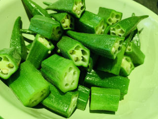 秋葵沥干水,去除秋葵根部,切段