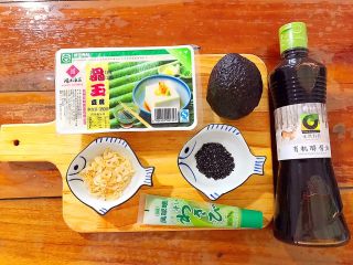 首先我们准备好所有材料! 一定要用可以凉拌吃的,其他豆腐不可以! 如果你没有淡虾皮,可以不加或者用肉松啊海苔啊替代! 的话最好用日式的吃刺身寿司的那种,芽芽因为是临时起意做的这道菜,所以没有特地去买,但是我这里用的这种生抽也是非常好的,很贵的呢~