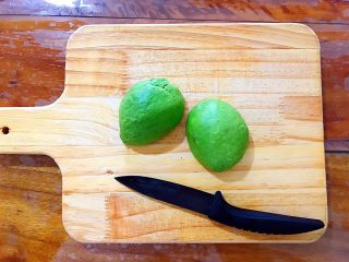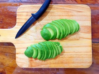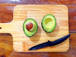 用锋利的水果刀,如图所示,在牛油果中间绕着划一圈,尽量划得深一点!