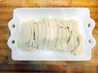 再来处理豆腐! 将豆腐从盒子里倒出来,装在盘子里,然后用刀,如图所示,划成一片一片! 芽芽今天有点心急,豆腐都被弄碎了,影响美观,宝宝们做的时候千万不要心急,心急吃不了热豆腐,哈哈~