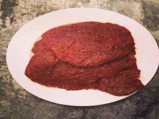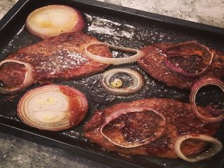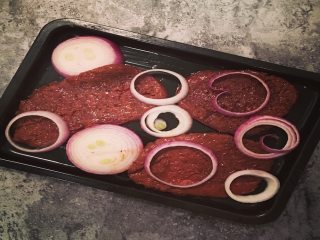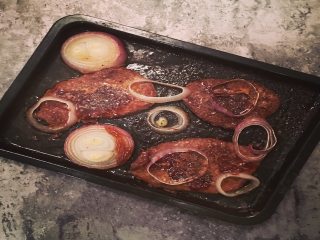 将烤箱预热,同时将腌制好的牛排放入烤盘,在牛排表面撒上圈,最后浇上耗油;