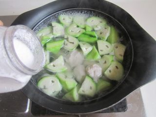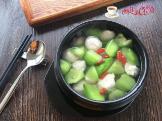 今天是做的懒人版的鱼丸, 按照平时的做法, 应该是用小刀将鱼肉慢慢的刮下来,再剁成鱼蓉; 而我已经请鱼摊主帮我剔去了鱼皮,自己回来就挑出大刺后,就将它与姜片和水一起放入搅拌器中搅打成蓉; 盛出后放入盐、胡椒粉和蛋清, 再用手工搅打上劲即可汆制鱼丸了。 温水煮好鱼丸后, 随意搭配些蔬菜下锅一同煮, 这样一道鲜美的鱼丸丝瓜汤就完成了。 自己做的鱼丸弹力十足、口感鲜嫩、货真价实, 吃到口里更放心。