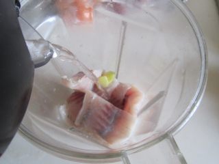 将去皮的鱼肉切成小点大块放入搅拌机中, 加入姜片和适量的水;