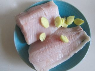选取鱼腹两块肉,再加入少许姜片;