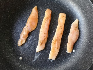 平底不粘锅预热后将腌制好的鸡胸肉放入先大火煎一下外表,封住内部的汁水,这样做出的鸡胸肉口感外焦里嫩,不发柴。