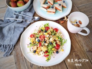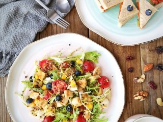 将所有烹制好的食材放入容器中,用颠盆的方法使食材混合均匀即可。(也可根据个人口味添加沙拉汁)