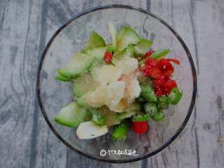 把萝卜、辣椒圈放入盆中,加入1勺糖、2勺醋、2勺酱油、一点香油、蒜片搅拌均匀。