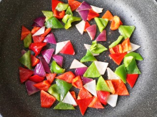 下入彩椒和洋葱爆炒断生后盛出备用。