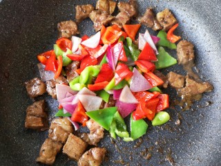 然后加入炒过的彩椒和洋葱继续大火翻炒。