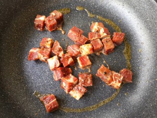 大火爆炒2-3分钟,大火能快速封锁住牛肉粒里面的肉汁,让牛肉吃起来口感软嫩多汁。