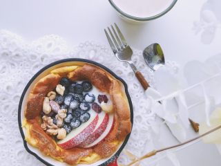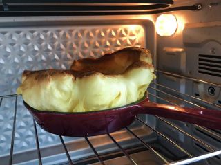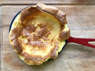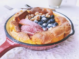 烤箱预热完成后,铸铁锅拿出来,把面糊倒入铸铁锅内!【我用的16cm的铸铁锅,你可以换成16cm左右的烤碗或者烤盘,此处是一人份, 两人份双倍量可以换20cm的烤盘锅等!烤盘烤碗的高度在5cm左右哦效果好】