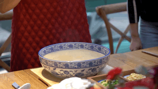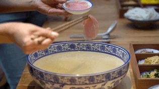 高汤熬制好后温度超过95摄氏度,盛汤的碗一定要大,先用开水烫碗,既起到消毒杀菌作用,又能加热碗壁,加入高汤后任何生的肉片下去5秒就熟透。