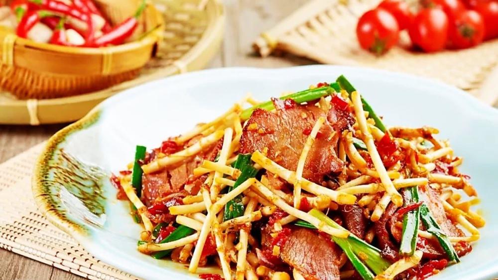 折耳根炒腊肉是贵州的一道名菜,也是一道家常开胃菜,具有提神醒脑的特点。折耳根就是鱼腥草,吃起来香脆爽口,可以清热解毒,但是有一些人不能接受它的气味。