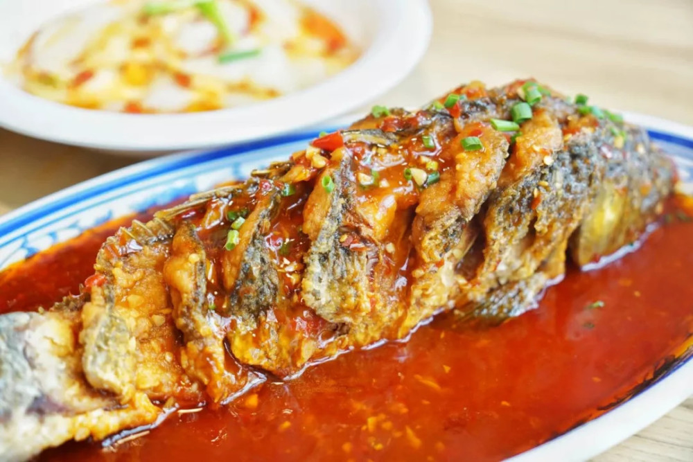 糟辣脆皮鱼是贵阳的传统美食之一,常被用作招待客人。鱼先油炸,然后加红辣椒、酒糟、姜和大蒜等烹制。这道菜色泽油亮,吃起来酸、甜、咸,并带着微微的辣味。