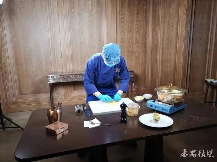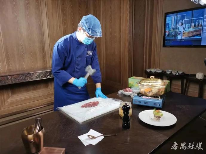菜品“冬笋花雕汁焗牛肉卷”是康莱德酒店Aroma馥观景餐厅主理人邵钧霆(James Shao)主理制作,他向小禺儿介绍了“冬笋花雕汁焗牛肉卷”的用料及做法,以及寓意,并亲自演示了制作的全过程。