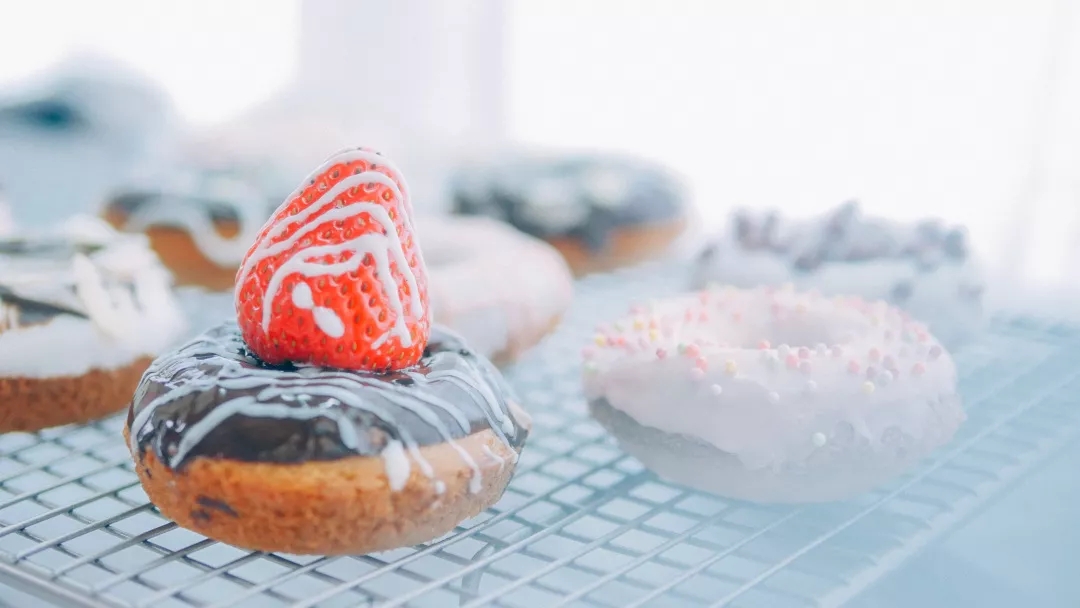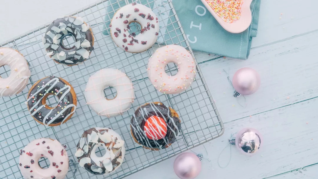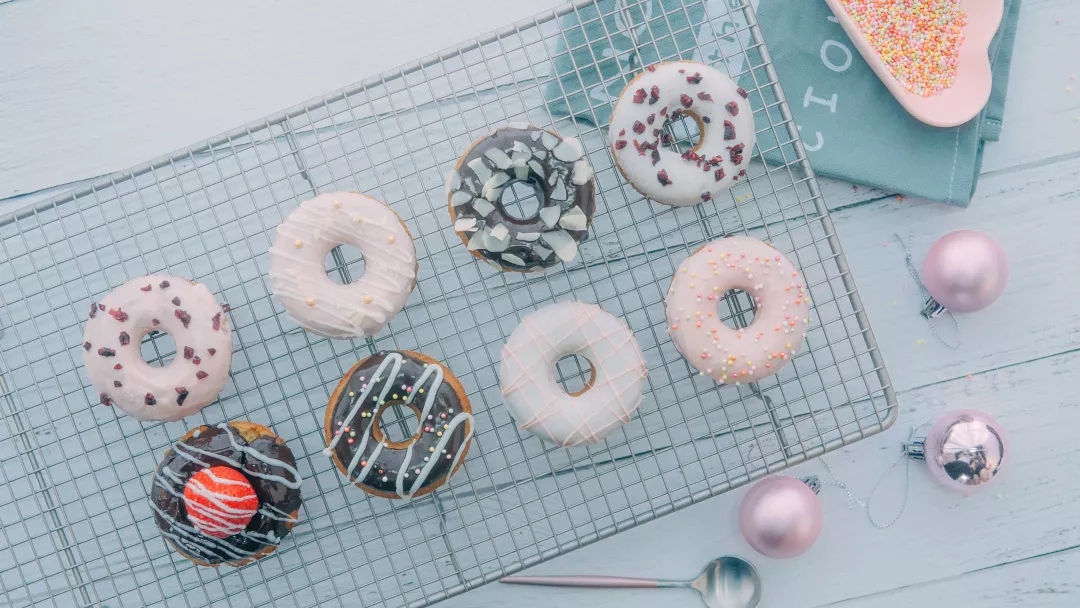 传统甜甜圈是油炸的,工序繁多复杂。而这次做烤箱版本的,搅搅搅,放入烤箱就搞定了,装饰方面自由发挥哦。 刚烤好的甜甜圈,外皮脆脆的,内部柔软。搭配果仁片和甜甜的巧克力也可,搭配酸甜的蔓越莓、高颜值的装饰糖亦好,吃起来都是不错的。 吃在嘴里,甜在心里。这么有爱的甜甜圈,赶紧动手做起来!