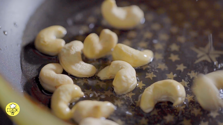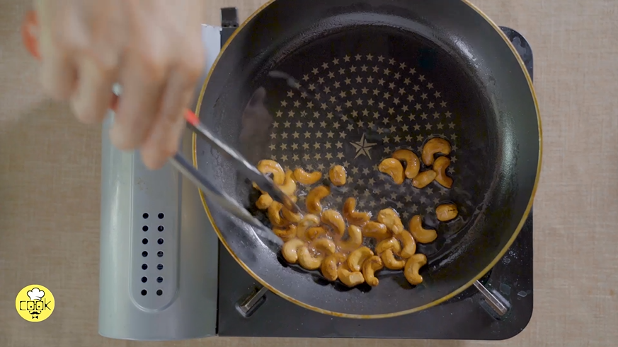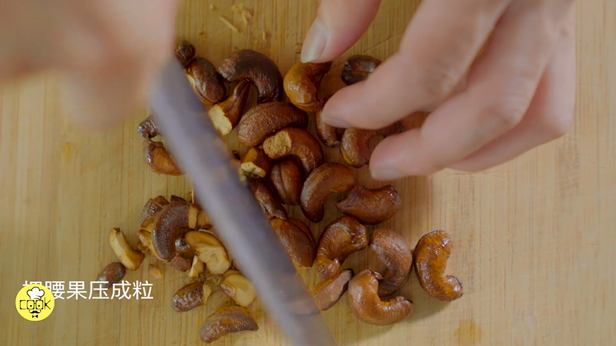 6.在锅中倒适量油,能没过腰果即可,将腰果炸炒至金黄捞出,切碎,再铺在沙拉碗中