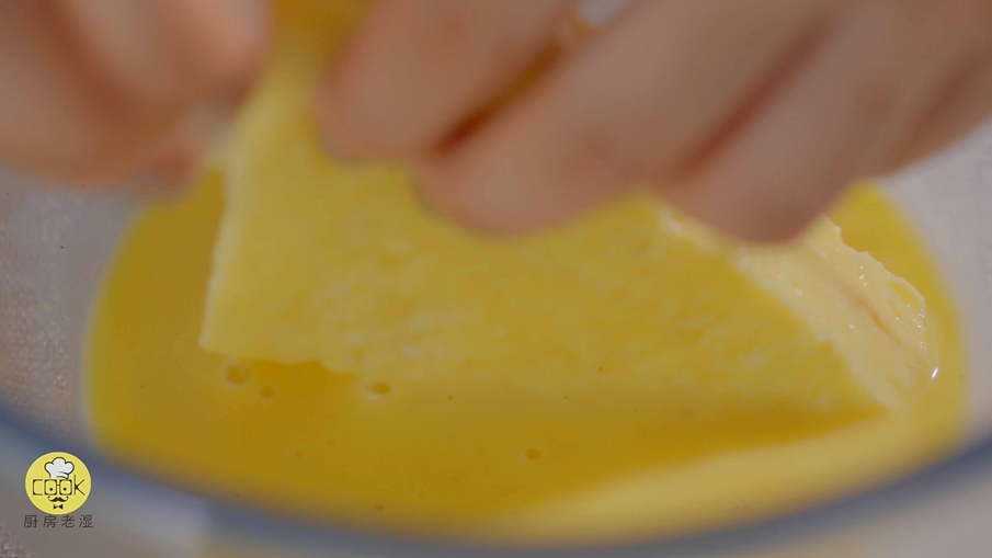 把刚刚切好的吐司均匀裹上蛋液