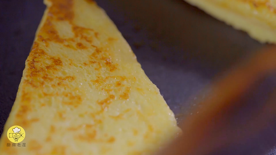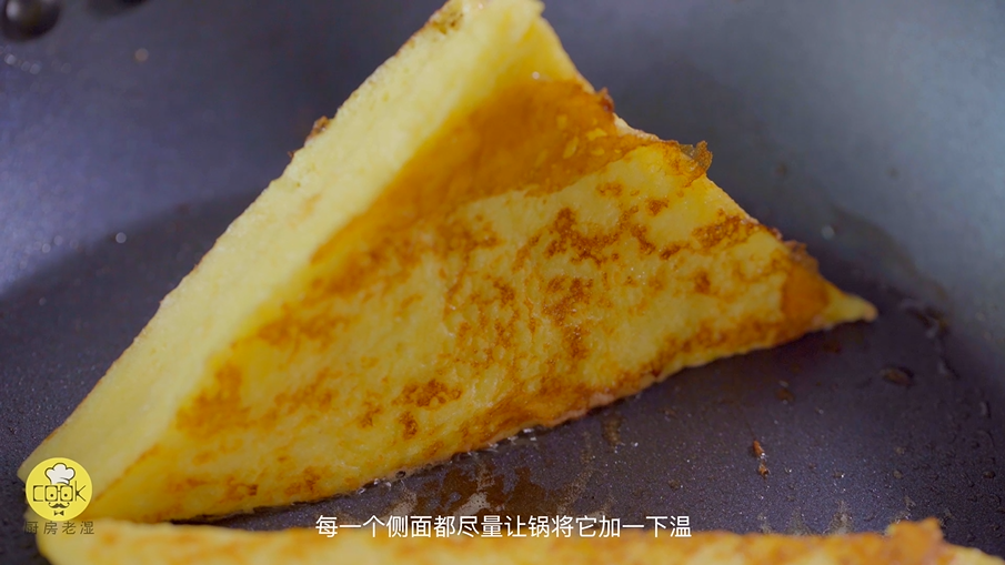 然后就可以煎西多士啦,中小火的话一分钟不到就可以翻面