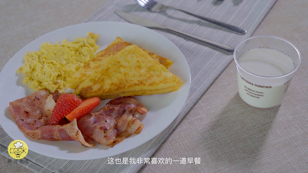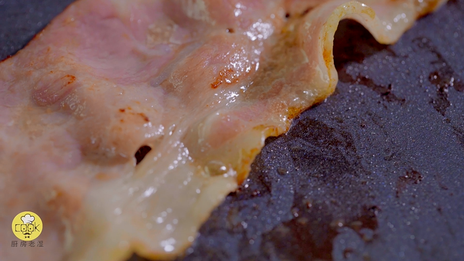 西多士部分完成啦!接下来就可以煎培根和蛋了,煎熟即可