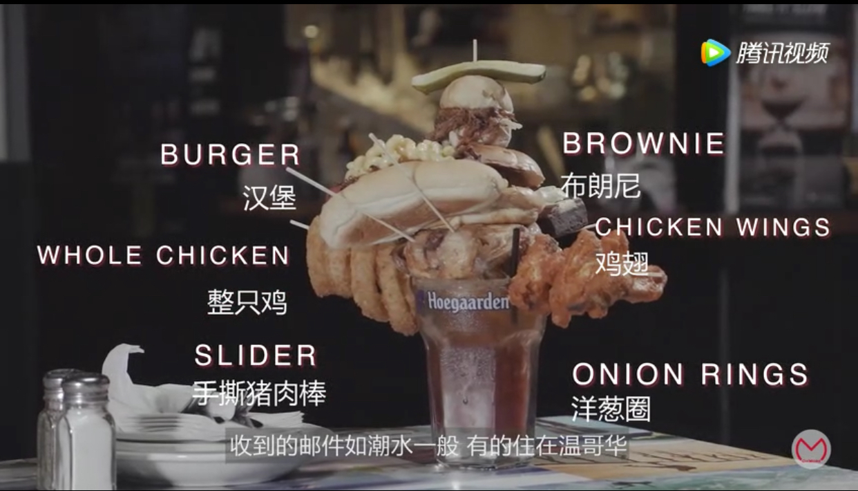 室外阳光小庭院 简约工业风装修风格 炫酷的字母留言墙壁 还有巨屏电视可以现场观看比赛 当然,人们慕名而来 都是为了这道60美元的食品传说 四盎司伏特加、一整只烤鸡、汉堡包 半打鸡翅、手撕猪肉棒、奶酪猪肉热狗 洋葱圈、烤蔬菜、一小块布朗尼蛋糕