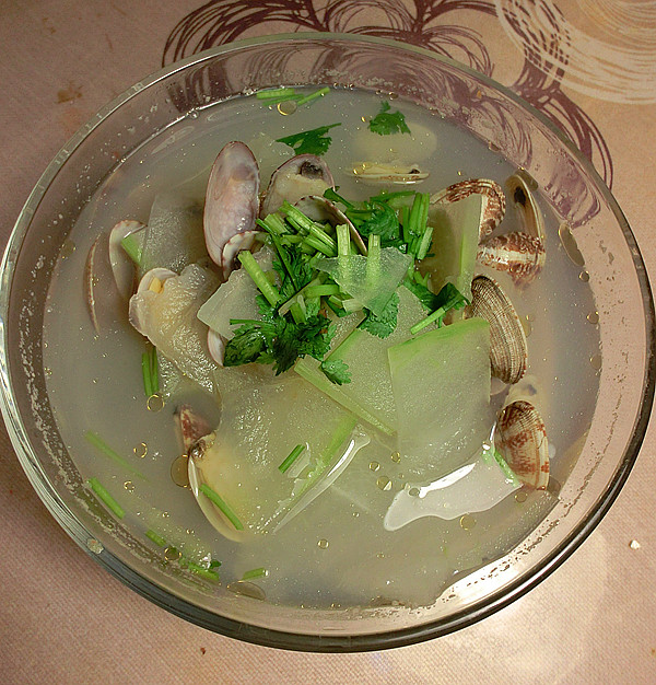 冬瓜蛤蜊汤(我们青岛叫旮旯),看起来还是挺有滋味的吧。这道菜我连锅都没呛,直接像煮粥一样,一股脑的仍到了锅里。