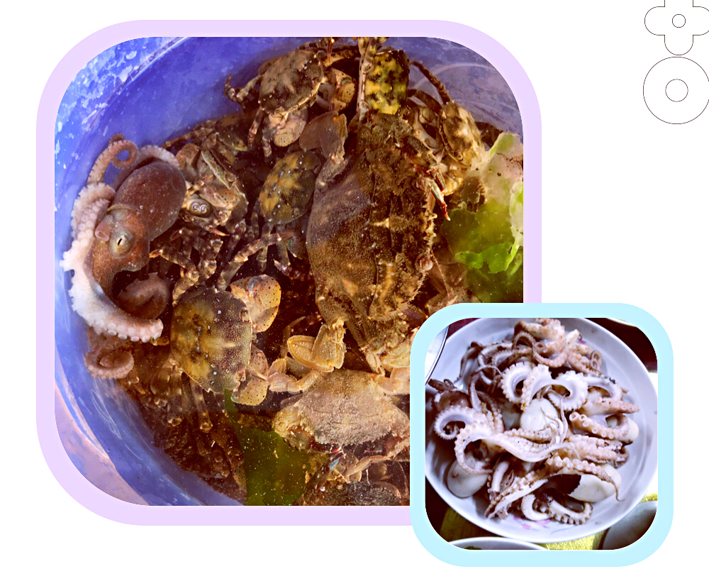 而务实的当地渔民则很有经验地翻找起螃蟹、海参、贝壳、小鱼和八爪鱼来。瞧我们找到的螃蟹,与盘中餐里的螃蟹是不是大小相仿?运气好的时候,我们甚至能找到比这些更大一点儿的螃蟹。