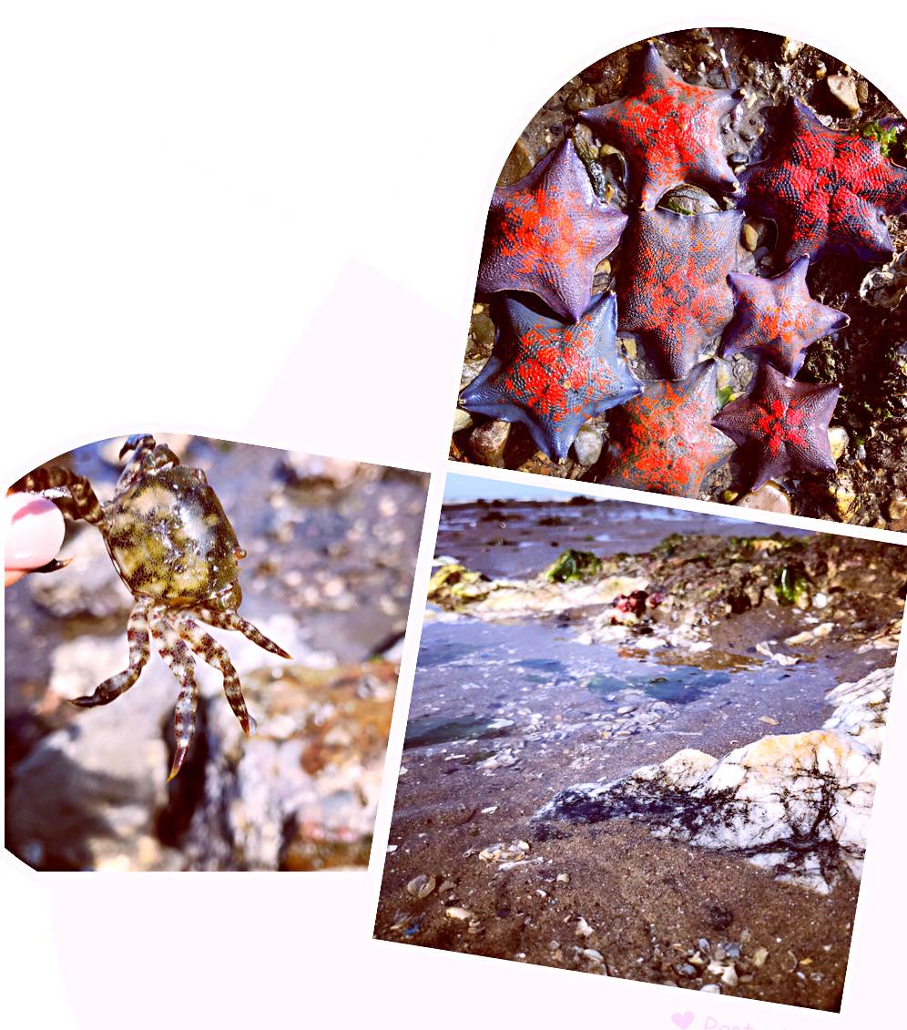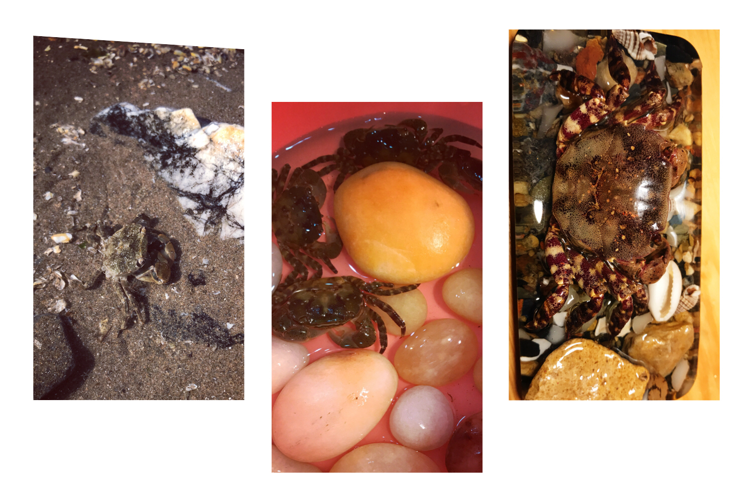 大约过了两个小时,大海涨潮了,滩涂上只留下三三两两的渔民在砸海蛎子,我们则乖乖地上了岸。低头一看小水桶里,额外的收获还有贝壳和小鱼。很不错啊!回想刚才每一次的翻找都带来无穷惊喜,最繁忙的景象莫过于翻开的一块大石头,底下一群小螃蟹因为终于见了天日,不得已地四散而逃的样子。每一只小螃蟹都像极了厨友参观金石滩的生命奥秘博物馆后带回家来的纪念品。