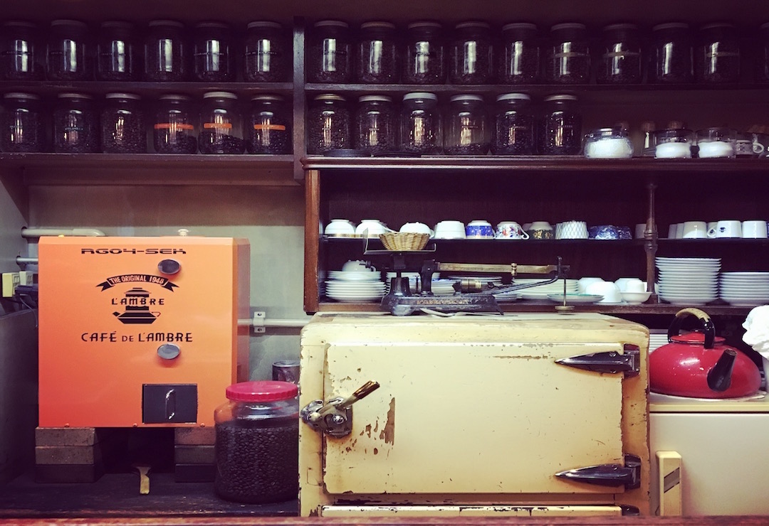 合作咖啡种植园的新鲜生豆就静静守候在烘焙室的门外,里面是一直沿用至今的富士咖啡烘焙机(Fuji Coffee Roaster),吧台后方一罐罐盛放烘焙咖啡豆的玻璃瓶整齐的摆放在木架上,其中不乏三十年以上的陈年老豆,老式冰箱和极少细粉研磨机可不是摆设,依然默默为来之世界各地热爱咖啡的客人们服务着。